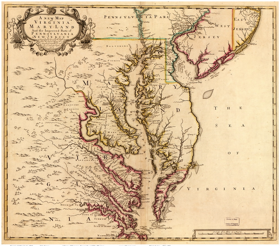 Our first relatives in Maryland all settled in Talbot County which lies on the Delmarva Peninsula, shown above with the purple marker. How did the Delmarva get its name? This peninsula is distinctive for the three states which make up its land mass, Delaware, Maryland and Virginia. The entire state of Delaware is contained within the bounds of the peninsula. Virginia claims the narrow bottom portion and the rest belongs to Maryland. The portion of Maryland that lies within the peninsula along the Chesapeake Bay is known as the Maryland's Eastern Shore.
