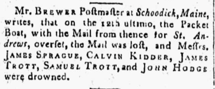 In 1798, Calvin married Mary Greelaw and the couple welcomed a son, James Calvin Kidder (4C5X) in January of 1799. Not three weeks after the birth of the child, Calvin was killed in a mailboat accident on the St. Croix River. Below is a notice of the incident in the Massachussets Mercury of Boston.