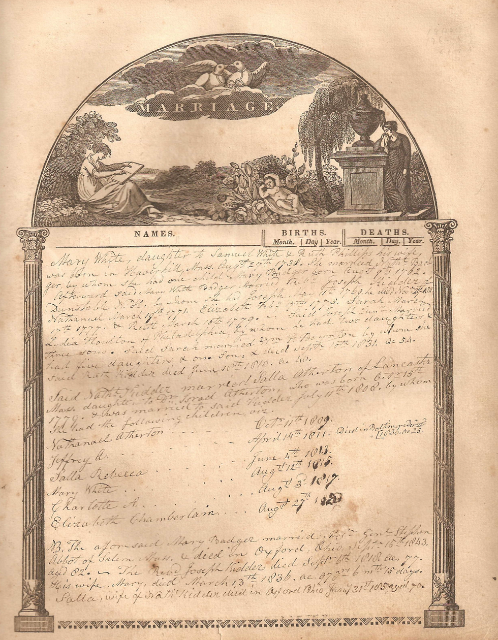 Below is a page of the bible which records the marriage of Nathaniel's parents, Joseph Kidder and Mary White: