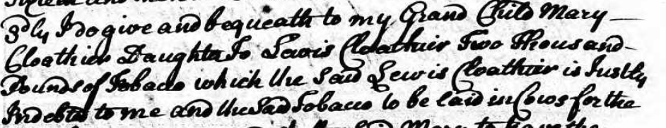 Robert's Knapp's bequest to his granddaughter Mary was quite different but it was a common practice in the day to forgive debts in a will. "...to my Grand Child Mary Cloathier Daughter To Lewis Cloathier two Thousand Pounds of Tobacco which the said Lewis Cloathier is Justly Indebted to me..."