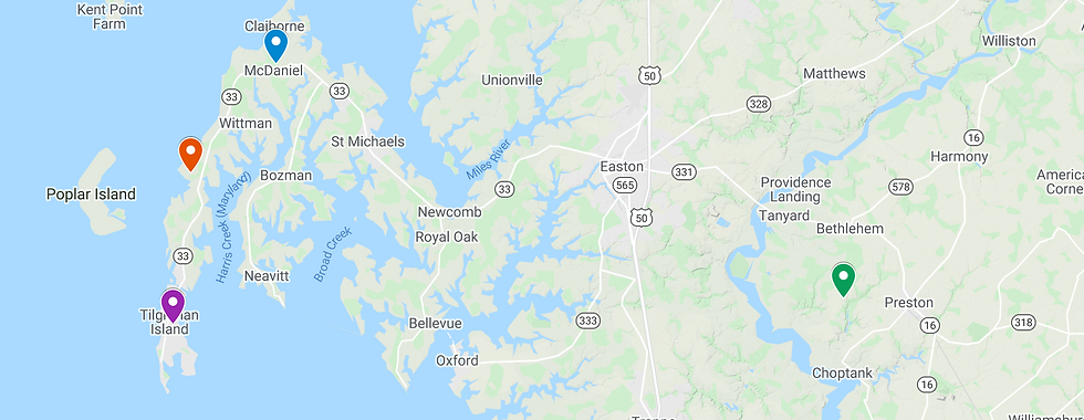 The land that Robert had surveyed, according to his will, was called Poplar Neck. The map below shows the the approximate location of Poplar Neck (red marker) in relation to Tilghman Island (blue marker) where Jane Kemp was born.