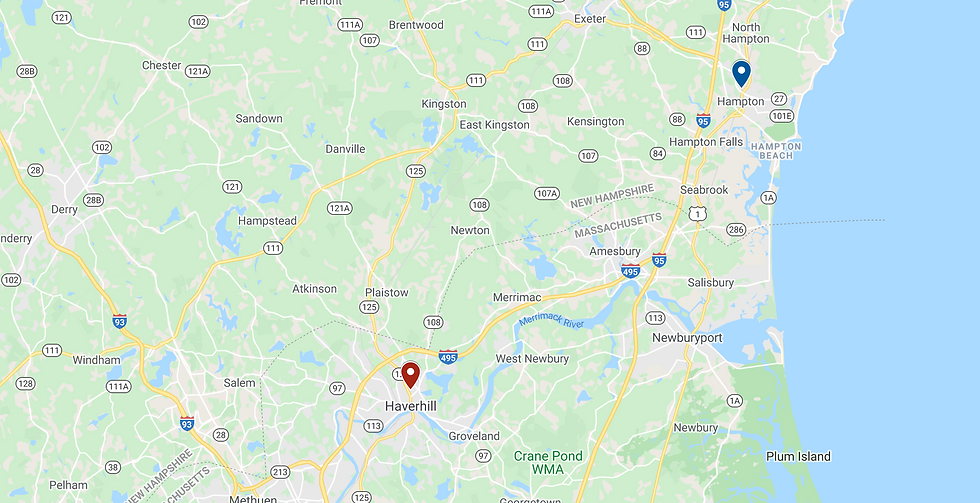 A smidgen less than twenty miles lies between Hampton, New Hampshire and Haverhill, Massachusetts. In 1650, when Mehitable Palmer (9GGM) of Haverhill married Samuel Dalton (9GGF) of Hampton, the two towns were still part of the same county, Norfolk, MA. It wasn't until 1679 the New Hampshire was made a separate colony.